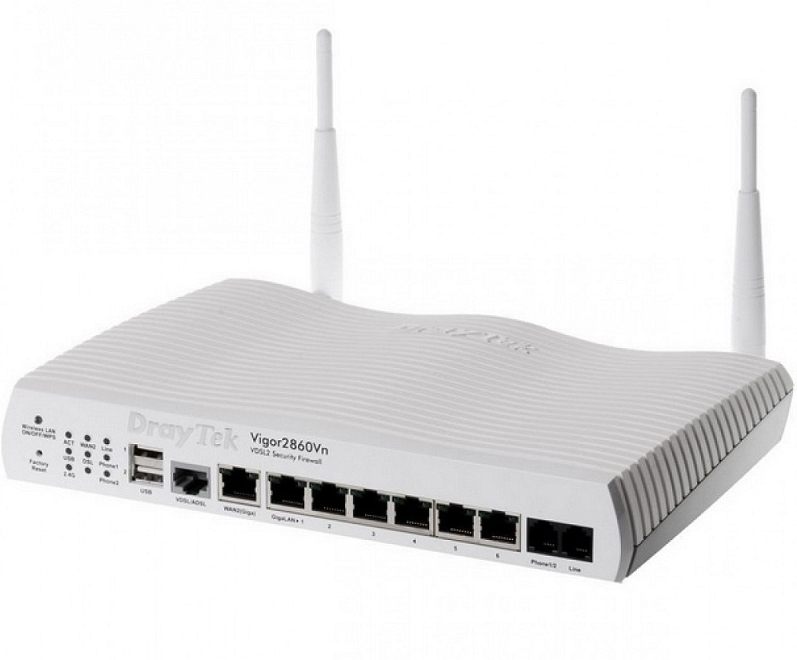 Маршрутизатор DrayTek Vigor 2860Vn – универсальное решение для частного использования, позволяющее резервировать внешнее соединение с сетью с помощью 3 разнородных технологий: АDSL, Еthernet и 3G/4G (за счет внешнего USВ-модема). Отличается модель наличием встроенного VoIР-шлюза, работающего по SIР-протоколу и допускающего подключение аналогового телефона и аналоговой линии. За счет встроенного управляемого коммутатора появляется возможность подключения до 6 устройств, при этом 1 - к гигабитному Ethernet-интерфейсу, а 5 - к 100-мегабитным. Порты позволяют управлять скоростью и активировать QоS, VLАN.